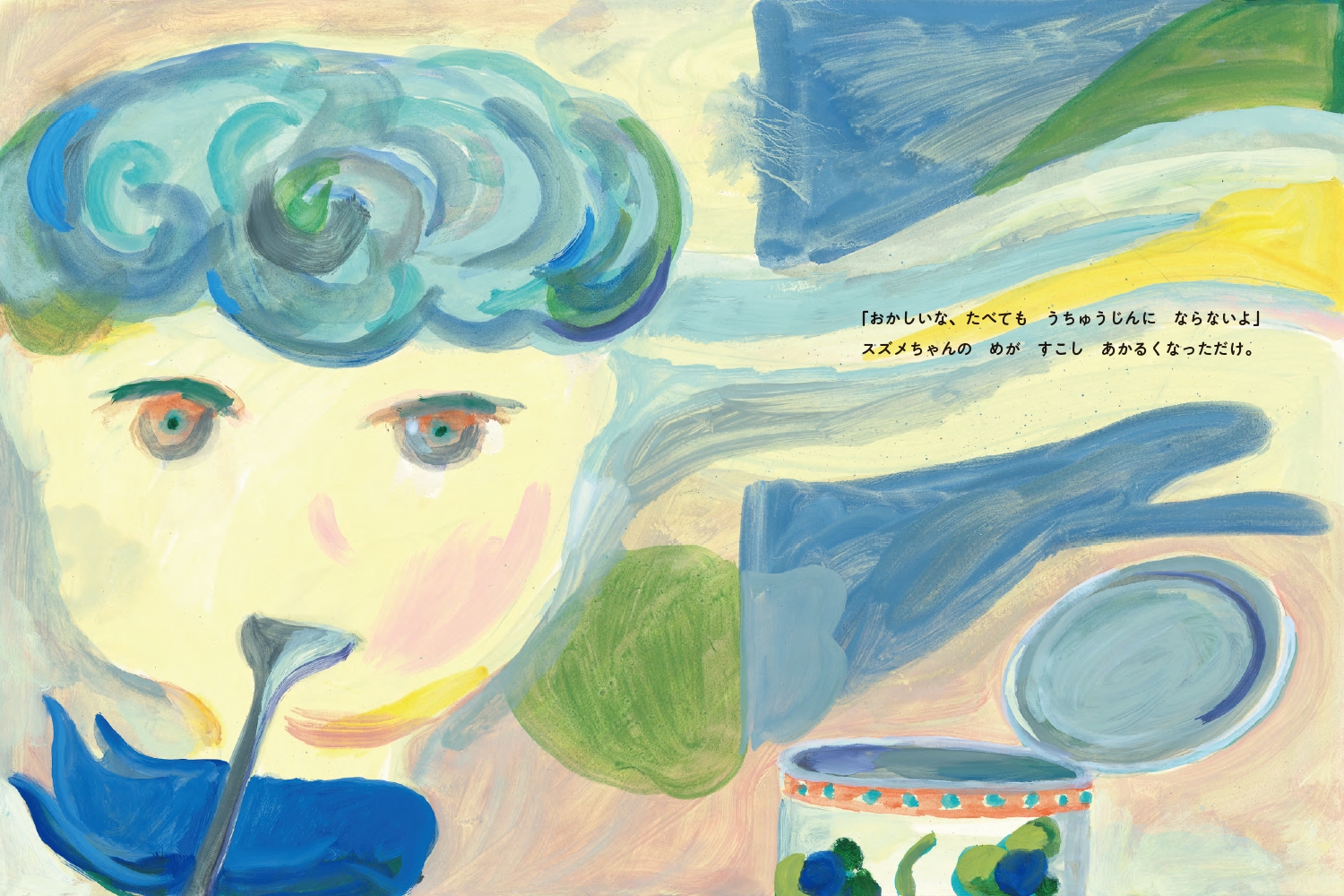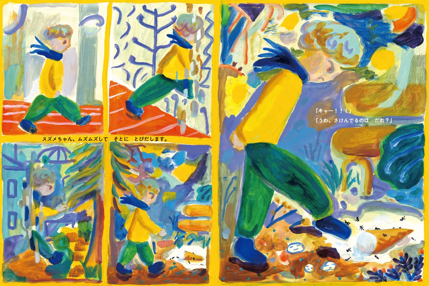 宇宙の星に住むスズメちゃんが宇宙人になる実を食べました。ムズムズして外に出ると、なんと生き物がみんな人間に見えてきたのです。スズメちゃん、どうなるのでしょう?