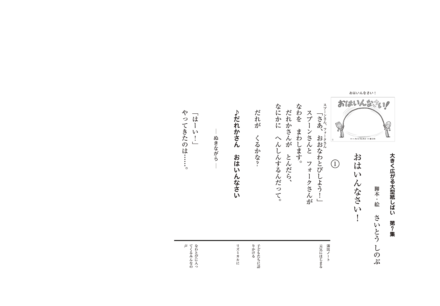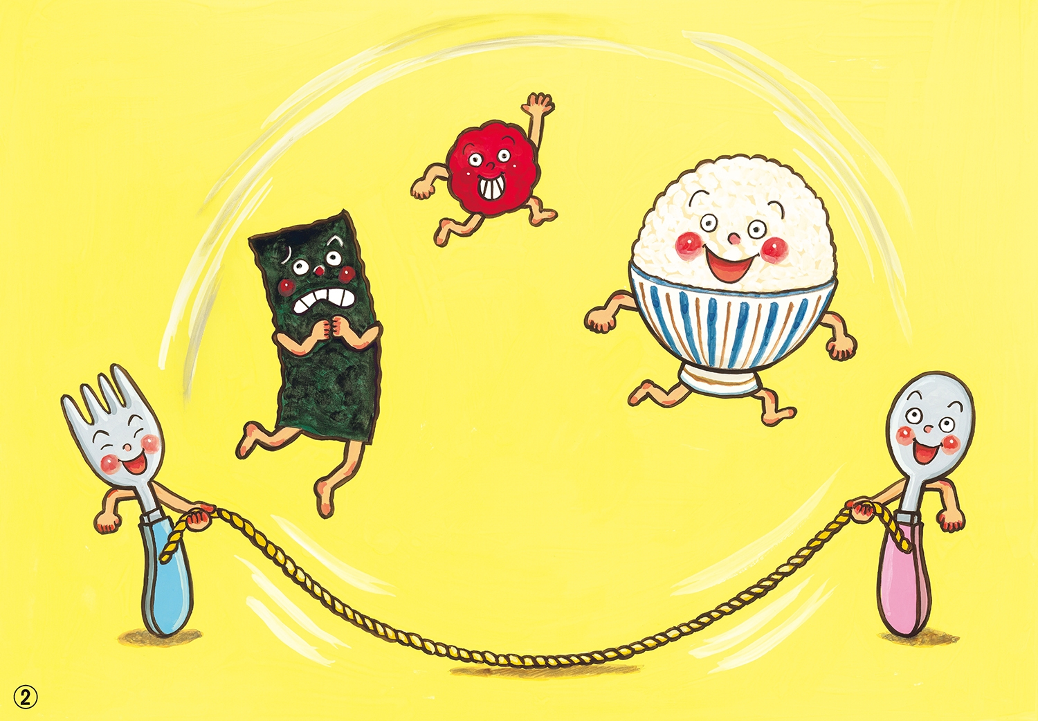 さあ、おおなわとびしよう! スプーンさんとフォークさんがなわをまわします。だれかさんがとんだら、何かにへんしんするんだって。♪だれかさん おはいんなさい……すると、「はーい!」って、ごはんさん、うめぼしさん、のりさんがやってきた。ピョン ピョン ピョンって、みんなでとんだら……おにぎりにへんしん! つぎにやってきたのは、ぎゅうにゅうさん、たまごさん、おさとうさん。今度はなににへんしんするかな?