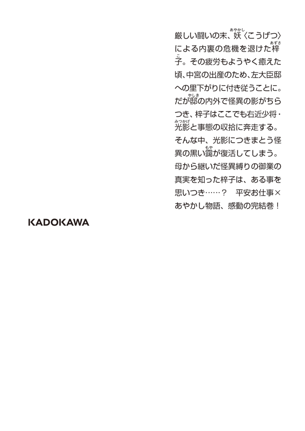 宮中に出現した危険な物の怪「こうげつ」との決着をつけ、光影との夫婦の絆も一層深まる中、梓子の仕える梅壺の女御、改め中宮が出産のために里下がりすることになった。