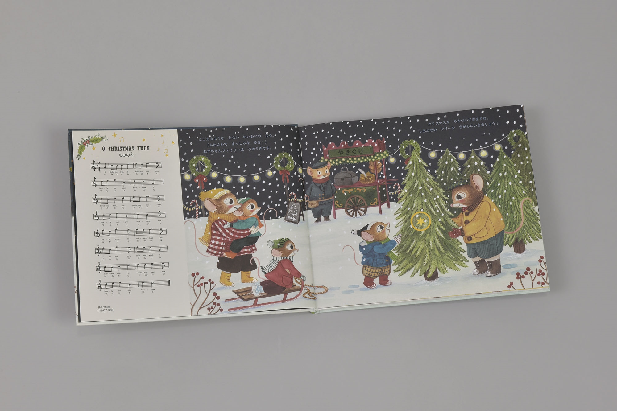 本の中のボタンを押すと「きよしこのよる」「赤鼻のトナカイ」など、日本でもおなじみのクリスマスソング8曲が流れます。音楽の解説も付いています。