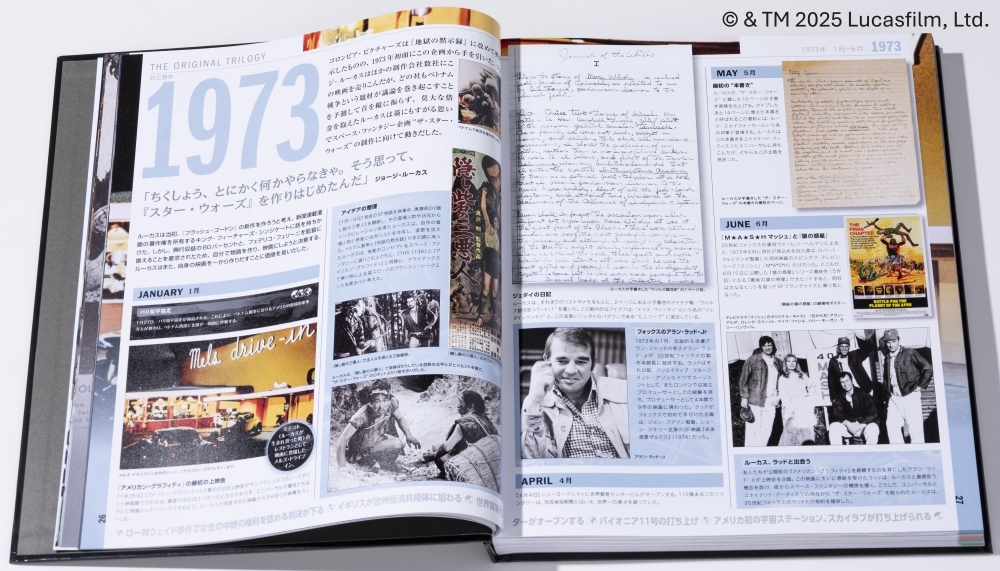 ジョージ・ルーカス監督の生い立ちから映画のスチール写真はもちろん、ルーカスの手書きの構想用紙やトリビア、マーチャンダイジングまで、スター・ウォーズを取り巻いた歴史を膨大なビジュアル資料で紹介しています。