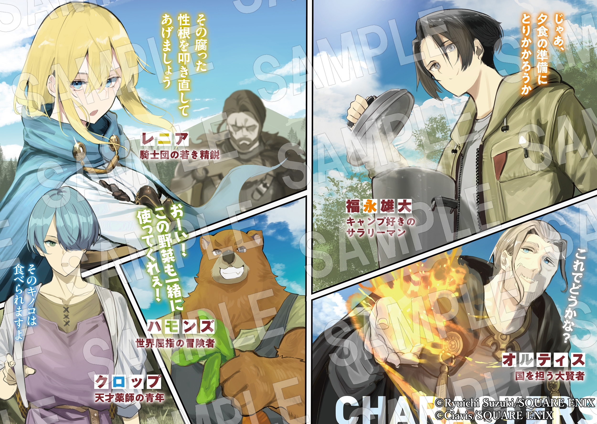 キャンプ好きのサラリーマン福永雄大はある日、景色の良い場所を探すうちに魔法を操る賢者オルティスに出会い、異世界に迷い込んだことを知る。それでも珍しい状況に上機嫌でテントを設営、釣った魚を塩焼きに。初めてのアウトドア体験に大賢者も興味津々で-- 「うまい!」オルティスの心と胃袋を掴み、晴れて二人は休日のキャンプ仲間となる。その後もベーコンの燻製やカレーを振る舞ったり、一緒に星空を眺めたりと、雄大はアウトドア趣味で次々に最強の異世界人たちを虜にしていき--。この週末は、異世界で穏やかなひとときを。ご一緒にいかがですか?