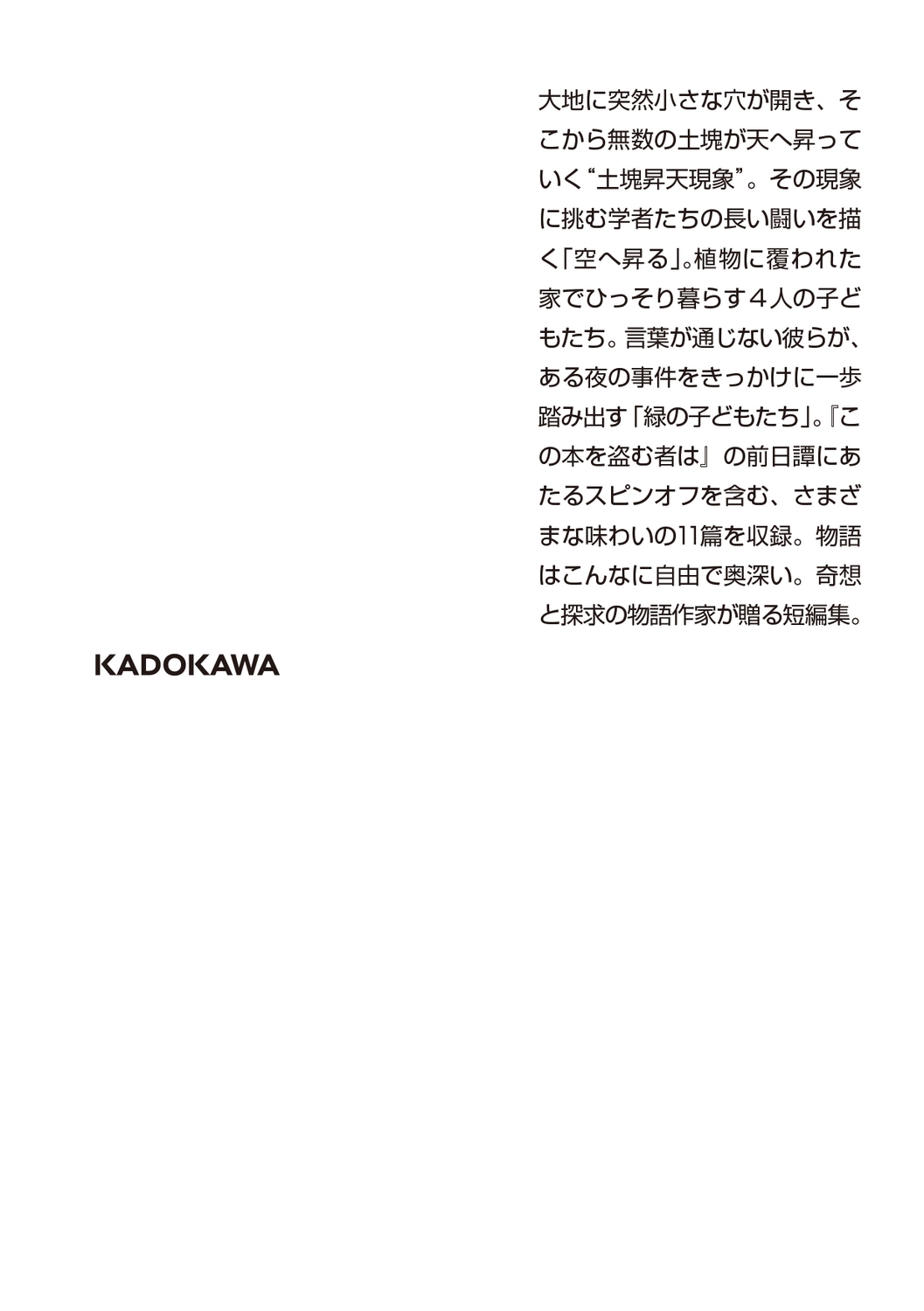 "読む楽しさ"がぎゅっと詰まったカラフルな11の物語。奇想と探究の物語作家、デビュー10周年記念作品集。植物で覆われたその家には、使う言葉の異なる4人の子どもたちがいる。言葉が通じず、わかりあえず、でも同じ家で生きざるを得ない彼らに、ある事件が起きて――(「緑の子どもたち」)。大地に突如として小さな穴が開き、そこから無数の土塊が天へ昇ってゆく"土塊昇天現象"。その現象をめぐる哲学者・物理学者・天文学者たちの戦いの記録と到達(「空へ昇る」)など。ミステリ、児童文学、幻想ホラー、掌編小説……書き下ろし『この本を盗む者は』スピンオフ短編を含む、珠玉の全11編。