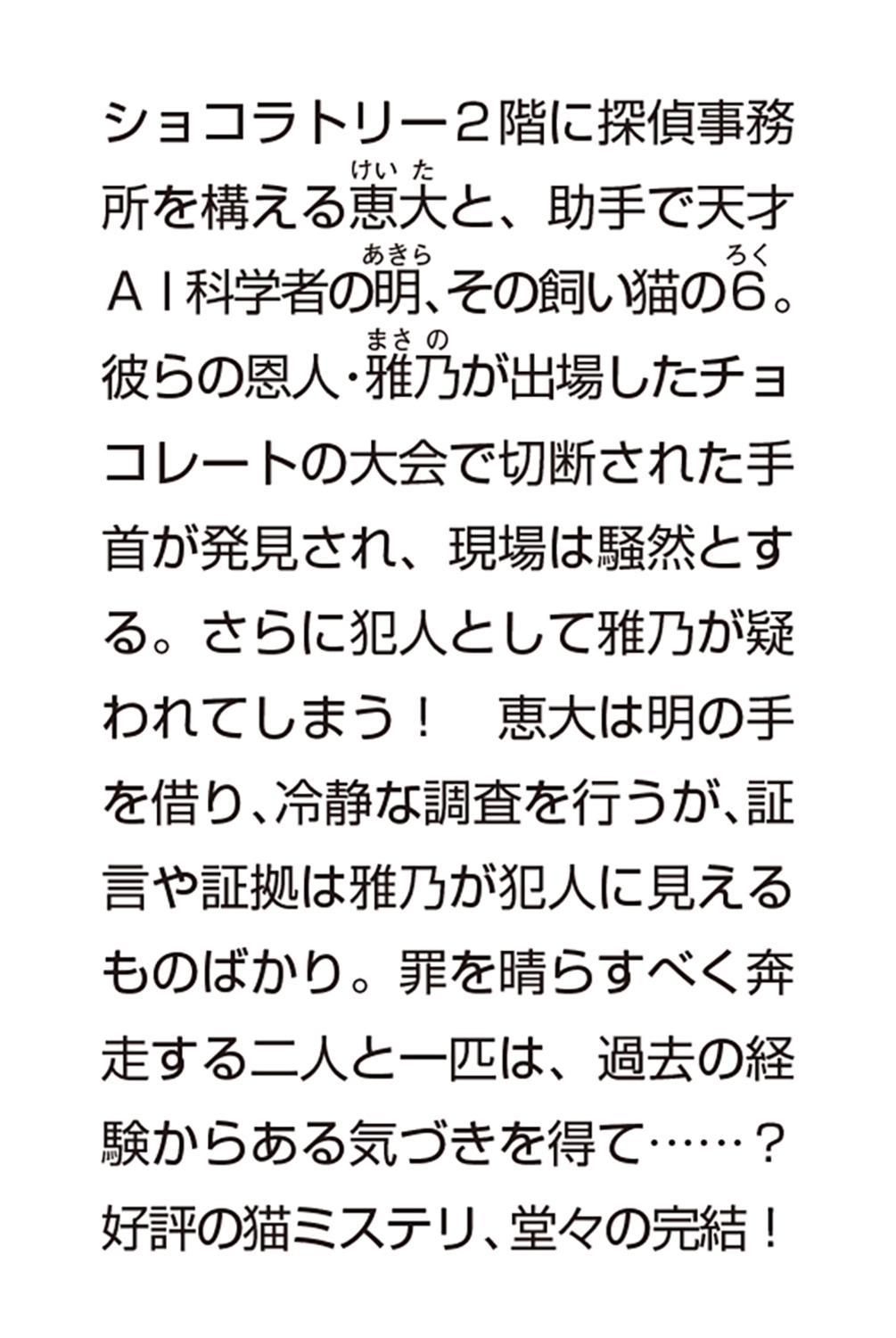 ショコラトリー2階に探偵事務所を構える恵大と、助手で天才AI科学者の明、その飼い猫の6。彼らの恩人・雅乃が出場したチョコレートの大会で切断された手首が発見され、現場は騒然とする。さらに犯人として雅乃が疑われてしまう! 恵大は明の手を借り、冷静な調査を行うが、証言や証拠は雅乃が犯人に見えるものばかり。罪を晴らすべく奔走する二人と一匹は、過去の経験からある気づきを得て……? 好評の猫ミステリ、堂々の完結!