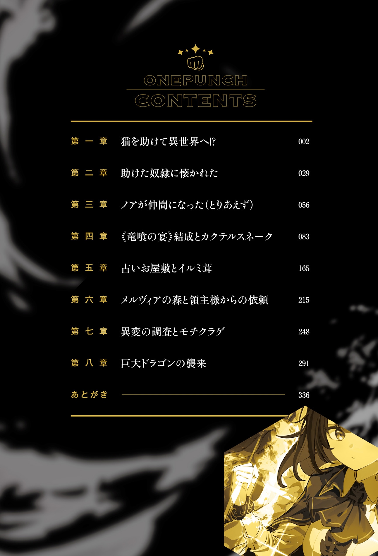 なんとドラゴンをワンパンで撃破! さらに、前世のアニメ知識から「ドラゴンって食べられる?」と考えたユーニャは、素手で鱗を剝ぎ、鑑定し、超強力な炎魔法で丸焼きに。唖然とする神獣猫をよそにドラゴンを食べると、あまりの美味しさに感動――!! そしてユーニャは、まだ見ぬモンスター〈食材〉を求めて旅に出ることを決意する。
