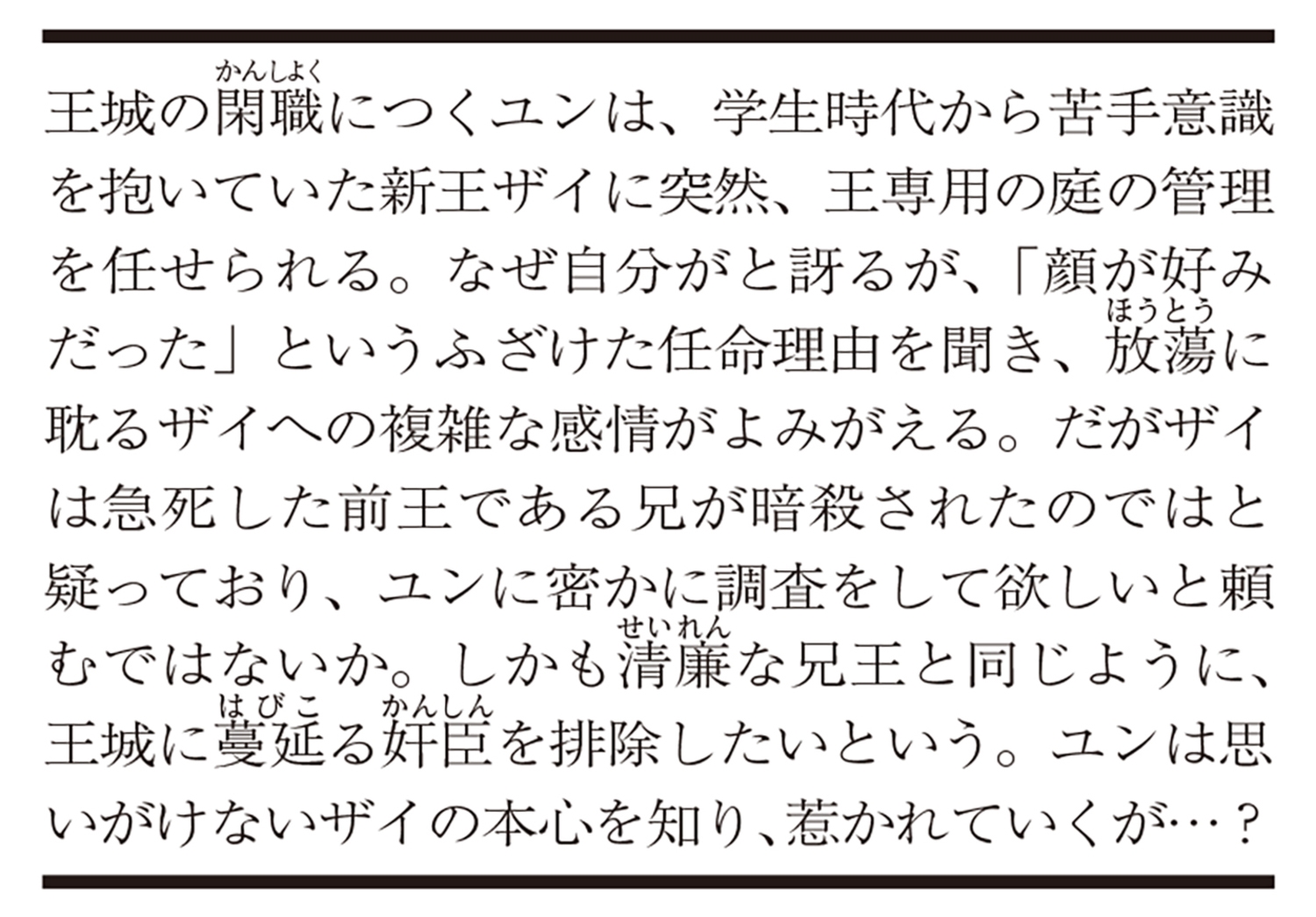 王城の閑職につくユンは、学生時代から苦手意識を抱く新王ザイに突然、王専用の庭の管理を任せられる。なぜ自分がと訝るが、「顔が好みだった」というふざけた任命理由を聞き、放蕩に耽るザイへの複雑な感情がよみがえる。だがザイは急死した前王である兄が暗殺されたのではと疑っており、ユンに密かに調査をして欲しいと頼むではないか。しかも清廉な兄王と同じように、王城に蔓延る奸臣を排除したいという。ユンは思いがけないザイの本心を知り、惹かれていくが…?