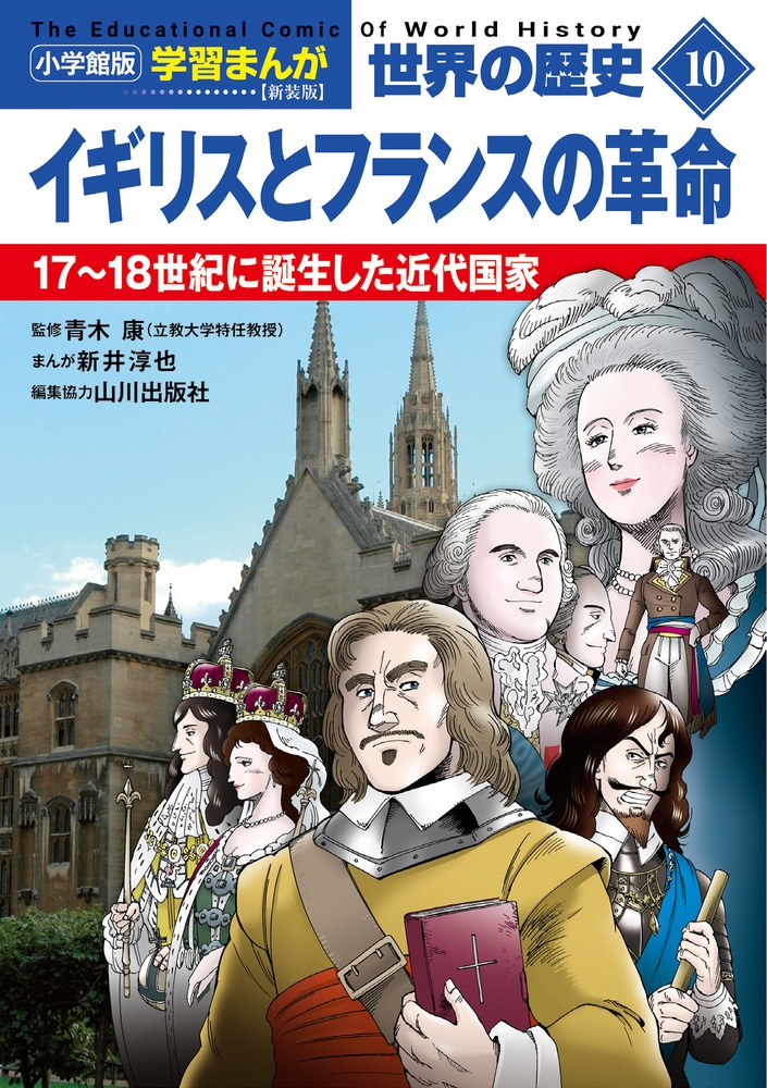 『小学館版 学習まんが世界の歴史 新装版』(全22巻)、第10巻では、イギリスとフランスで起こった、絶対王政に対する革命の様子を取り上げます。王権神授説を唱えたイギリス国王チャールズ1世に対するピューリタン革命やその後の名誉革命、国王ルイ16世と王妃マリ=アントワネットを処刑に追い込んだフランス革命が描かれます。
