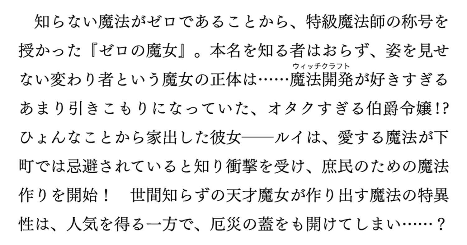 知らない魔法がゼロであることから、特級魔法師の称号を授かった『ゼロの魔女』。本名を知る者はおらず、姿を見せない変わり者という魔女の正体は……魔法開発(ウィッチクラフト)が好きすぎるあまり引きこもりになっていた、オタクすぎる伯爵令嬢!?