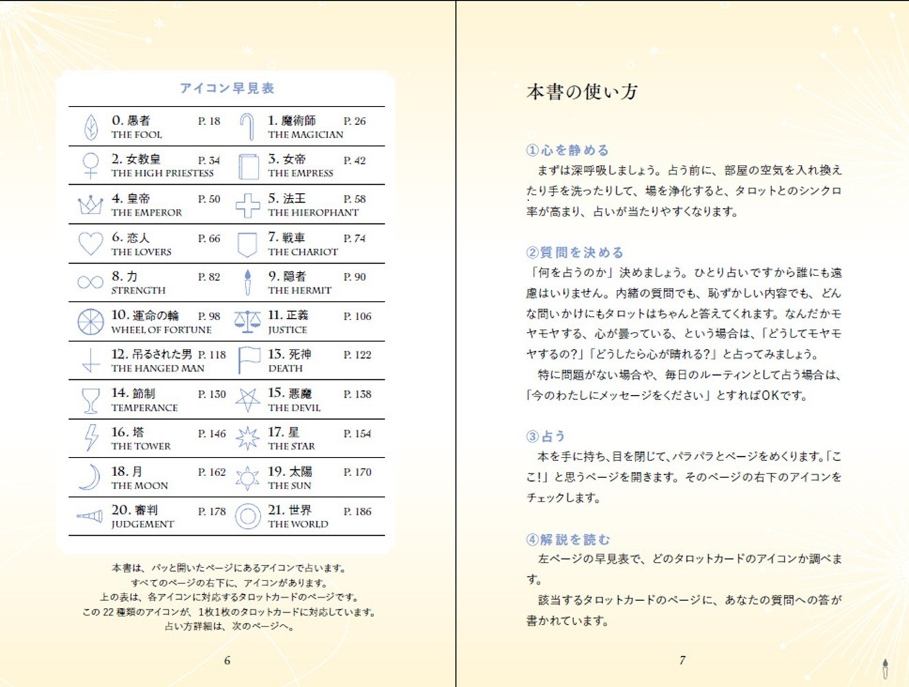 3 アイコン早見表(P6)で、対応するタロットカードを調べます。