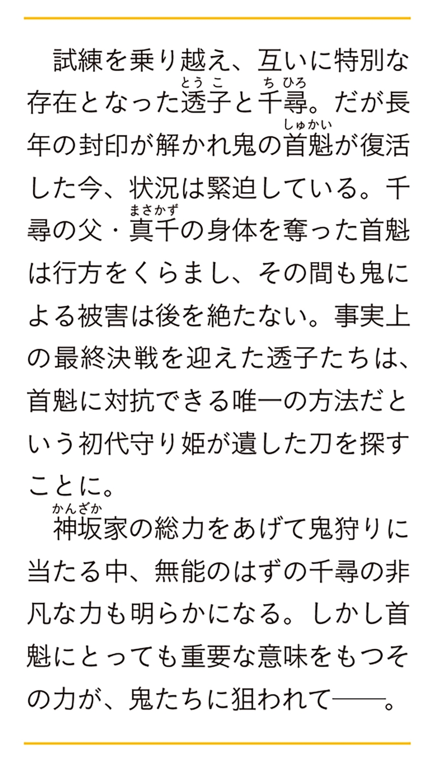 神坂家の総力をあげて鬼狩りに当たる中、無能のはずの千尋の非凡な力も明らかになる。