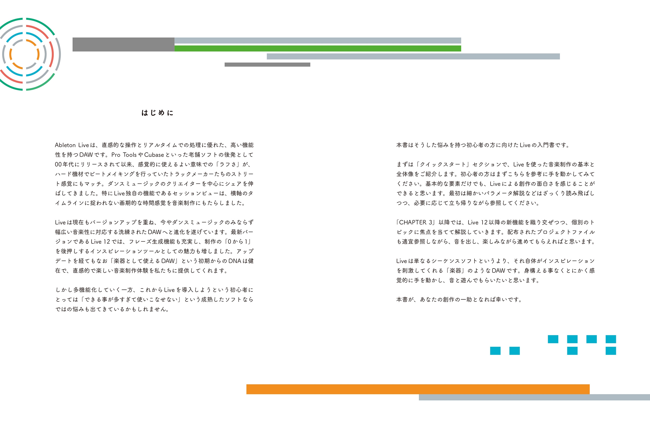世界中のアーティストが愛用するDAWソフト「Ableton Live」を、基礎からじっくり学べる入門書です。基本操作から作編曲、サウンドデザイン、ミックス、リアルタイム表現まで、手を動かしながらしっかりマスター。美学校の講師が、実践の流れに沿ってLiveの魅力と使いこなし方をナビゲートします。