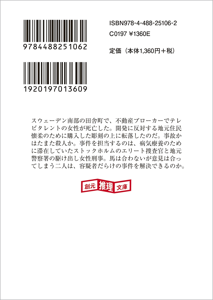 スウェーデン南部の田舎町エステリエンで、不動産開発を目論んでいた不動産ブローカーでテレビタレントの女性が死亡した。開発に反対する地元の住民を懐柔するために購入した彫刻の上に転落したのだ。事故か、はたまた殺人か。事件を担当するのは、病気療養のために現地に滞在していたストックホルムの敏腕捜査官と、地元警察署の駆け出し女性刑事。馬は合わないが意見は合ってしまう二人は、容疑者だらけの事件を解決出来るのか。